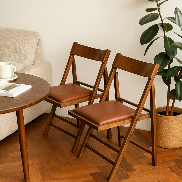O Kit com 2 Cadeiras Dobráveis da Preebel oferece o equilíbrio ideal entre conforto, praticidade e visual rústico. Fabricadas em madeira maciça com acabamento castanho, possuem encosto anatômico e assento estofado em courino, disponíveis nas cores telha, preto ou bege. São ideais para compor desde salas e varandas até eventos e ambientes compactos.