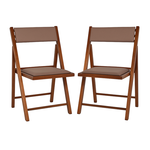 Práticas, confortáveis e cheias de estilo. As cadeiras dobráveis Preebel são ideais para quem valoriza funcionalidade sem abrir mão do bom gosto. Este kit com 2 unidades combina estrutura em madeira maciça com acabamento castanho e estofamento em courino de alta qualidade, proporcionando conforto em qualquer ocasião. O sistema dobrável permite fácil transporte e armazenamento, sendo perfeito para ambientes compactos, recepções, eventos e áreas gourmet.