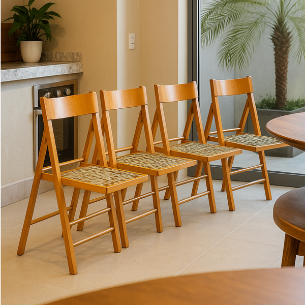 O Kit com 4 Cadeiras Dobráveis da Preebel é a solução prática e elegante para compor ambientes como varandas, áreas gourmet, cozinhas ou espaços multiuso. Com estrutura em madeira maciça e assento em corda náutica tramada, elas são leves, resistentes e fáceis de guardar quando necessário.